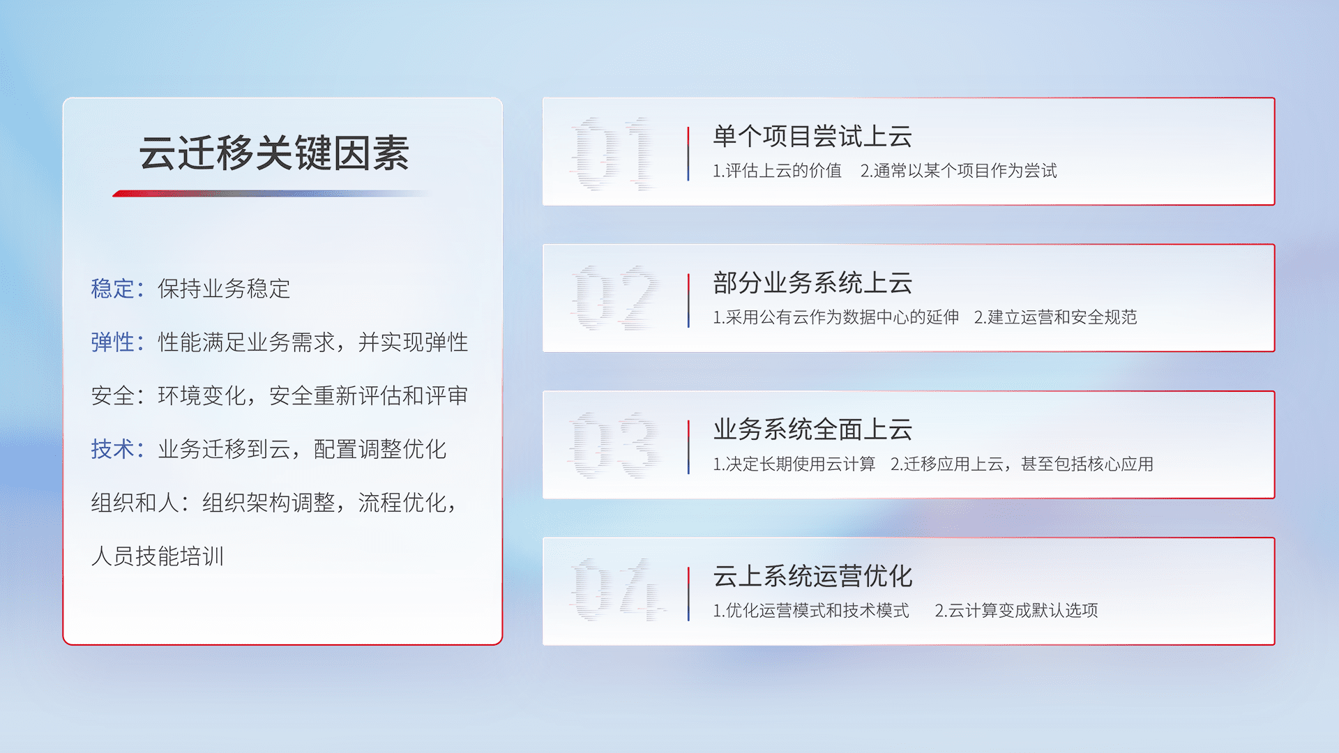 结合实际业务,,,从规划设计、、、云平台选型、、、云原生改造、、、数据迁移、、、集成交付,,迁移全过程为客户识别最佳上云路径,,做好风险识别管理,,,设计网络架构、、身份权限、、、安全审计合规、、操作审计、、、日志审计、、、、监控告警策略、、、多站点容灾设计等,,对云上基础设施进行整体规划,,,,提升IT治理水平,,,,以满足弹性、、、高可用、、、高性能的需求。。。