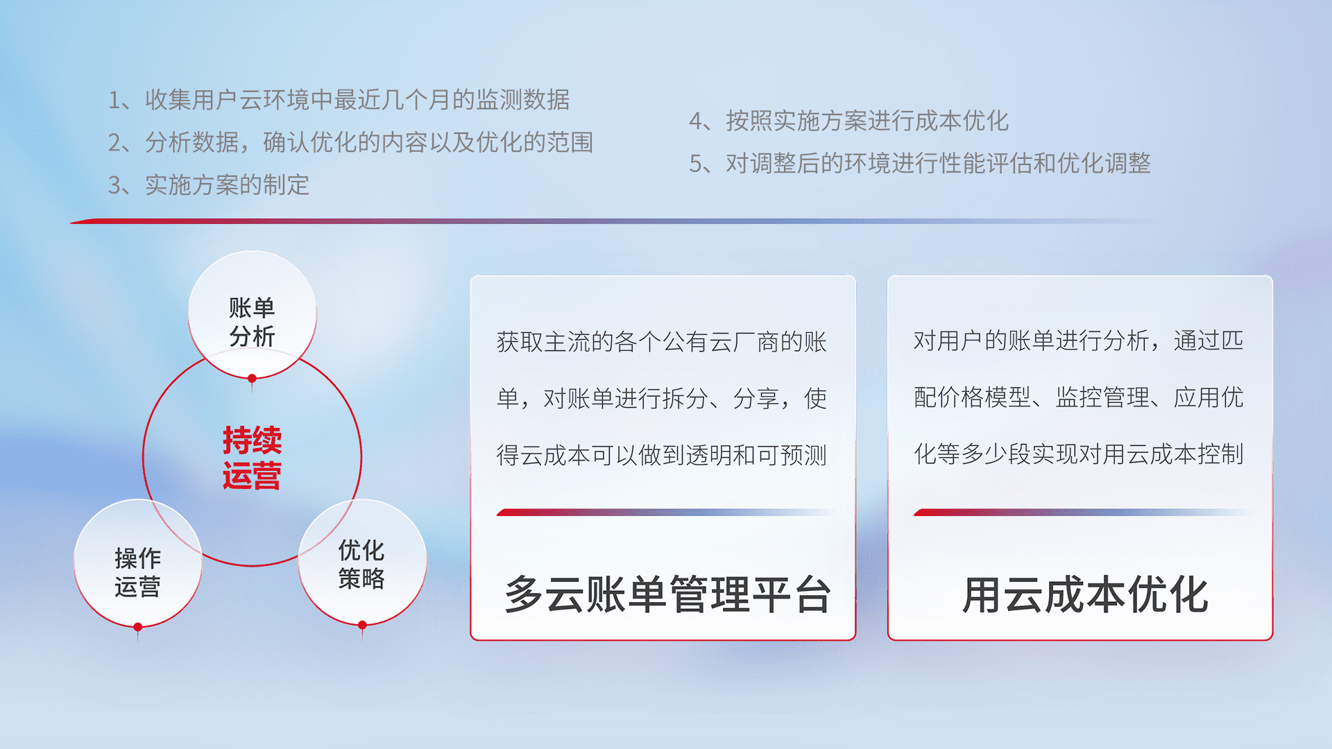 通过多云纳管,,,以统一的资源数据模型把客户的云资源进行抽象和封装,,,,进而实现对多云资源的统一操作,,保障云资源管理的可靠性、、、、稳定性与可用性。。量身定制化运维内容,,配置、、、开发运维、、、补丁管理、、、备份、、、监控、、、、认证和访问管理、、、审计和日常巡检等,,,保障在用云过程中的可靠度,,,,稳定度以及高可用率。。。
